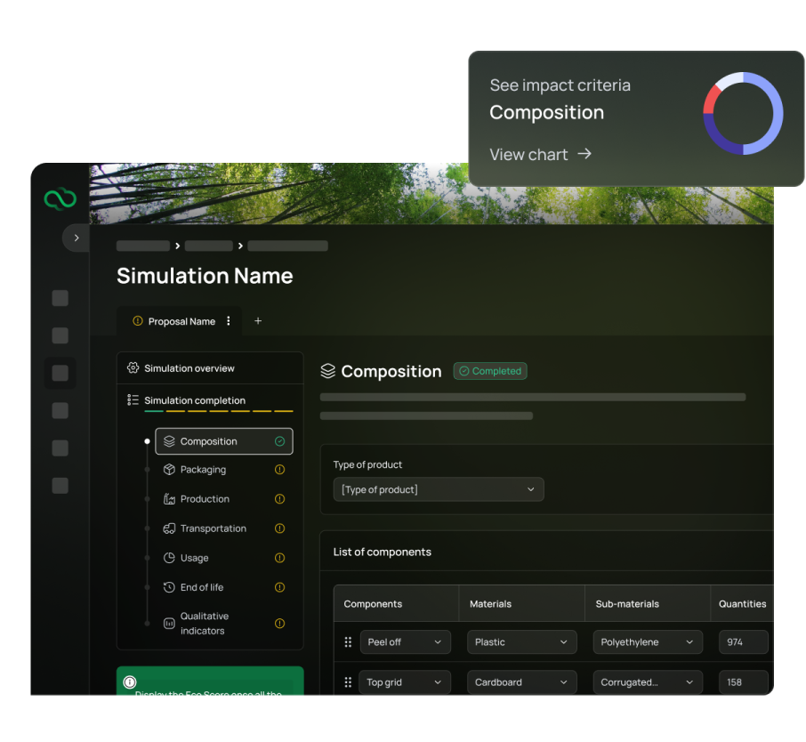 Automate LCAs for every product of your company's catalog and roll them out as product models, enabling you to manage an eco-designed product portfolio based on standardized and normalized Eco Score. Iterate your what-if scenarios to improve sustainability or import them into your company' projects to respond with one click to your clients demands and business opportunities.